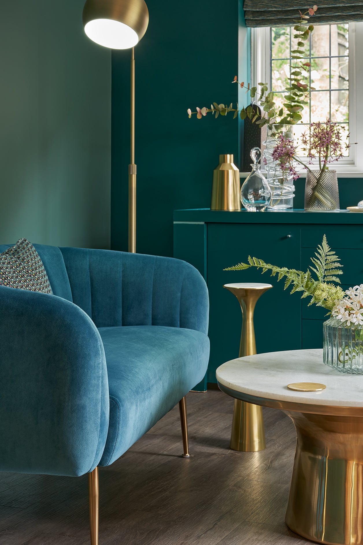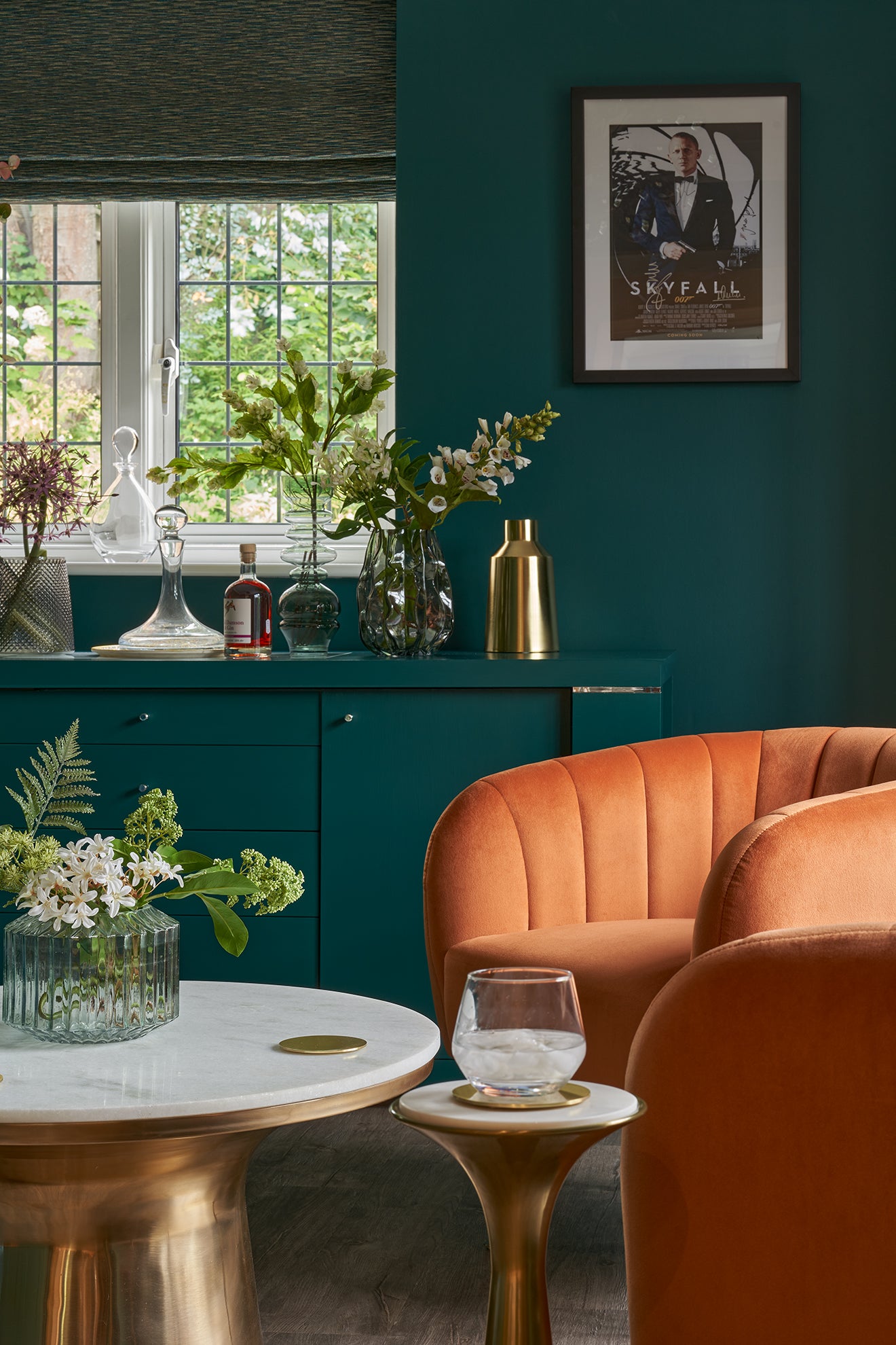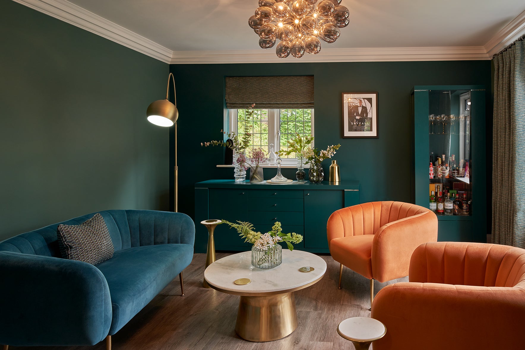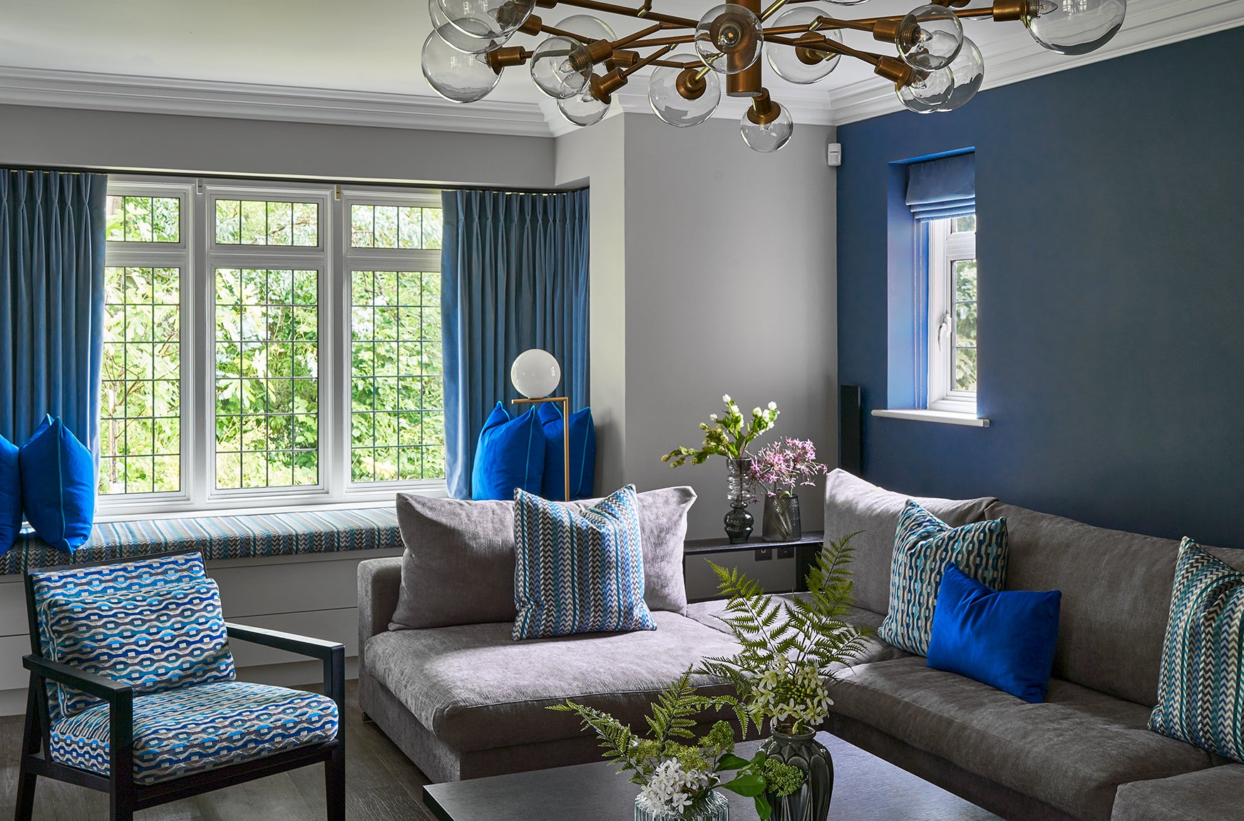 Throughout the home, we wove a palette of blues and teals with warm neutrals, lifted by touches of turmeric and burnt orange. The living room gained focus with a navy feature wall that enhances TV viewing, while a bespoke window seat turns the bay window into a functional space with hidden storage.