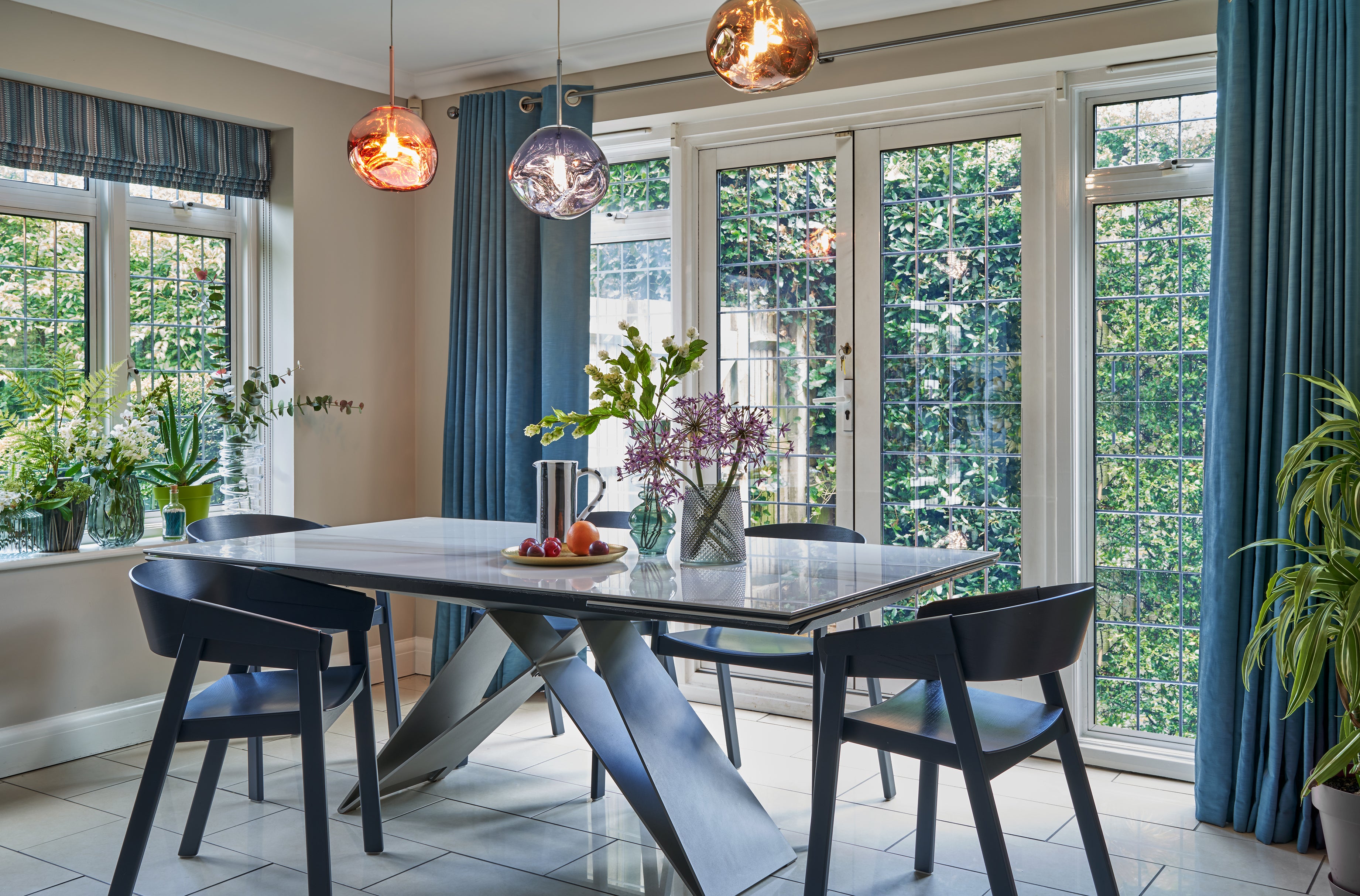 In the kitchen and dining area, we brought new life to wooden cabinetry with fresh paint, adding a designer dining table and chairs and Tom Dixon lighting to create a contemporary feel.