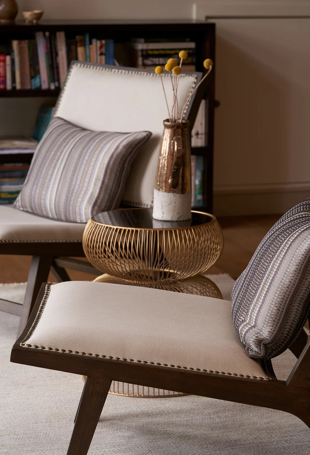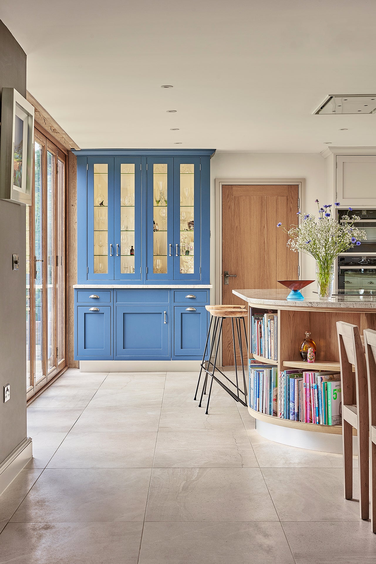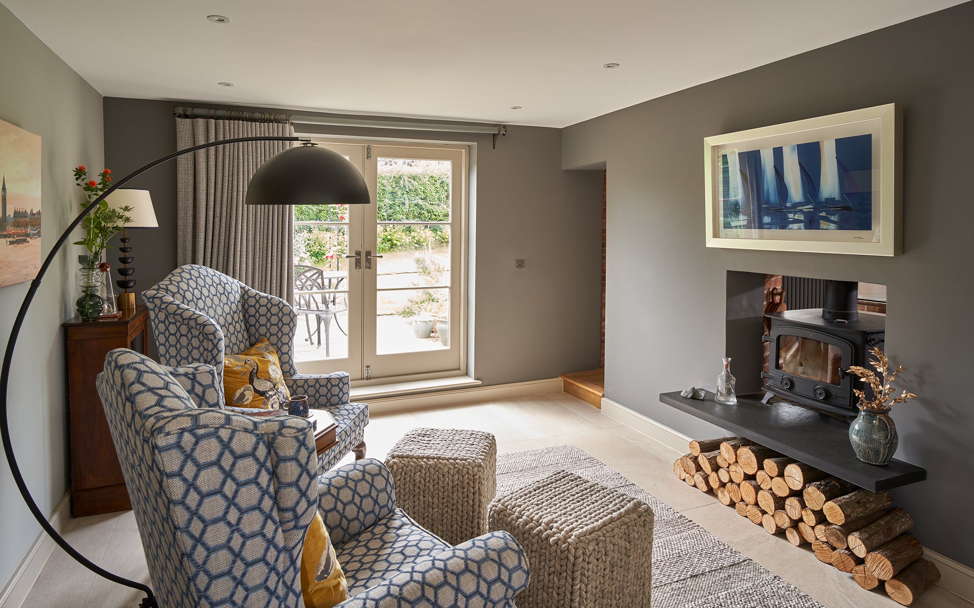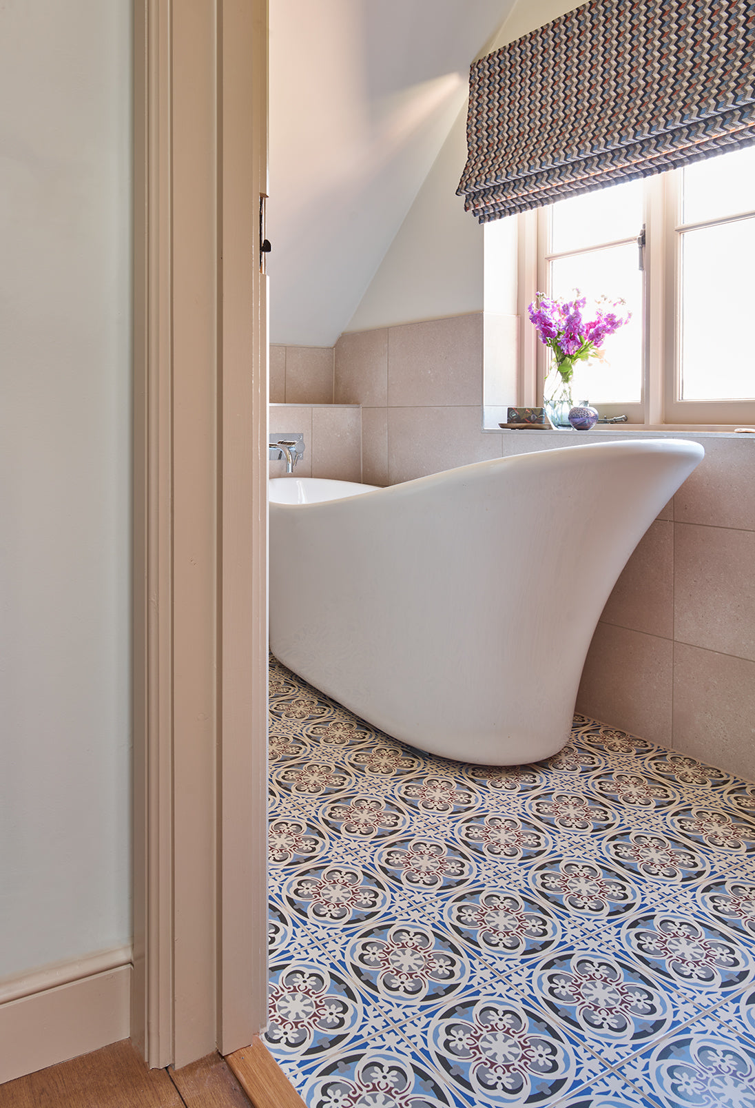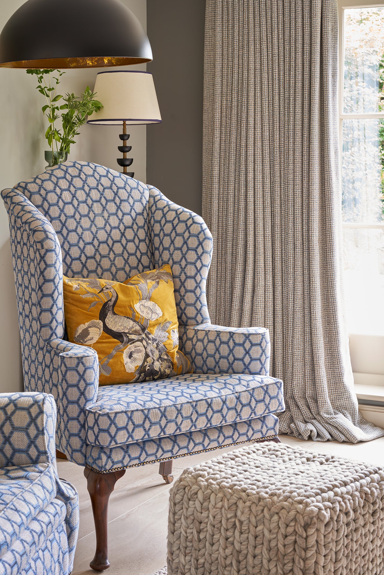 We created visual harmony through a considered palette of blues, greys, yellows and oranges, warmed by soft neutrals. These tones enhance natural light and bring year-round warmth to both the historic and modern spaces. A distinctive hexagonal pattern flows through the house, appearing in terracotta hallway tiles, reupholstered chairs and window dressings, subtly connecting different areas.
