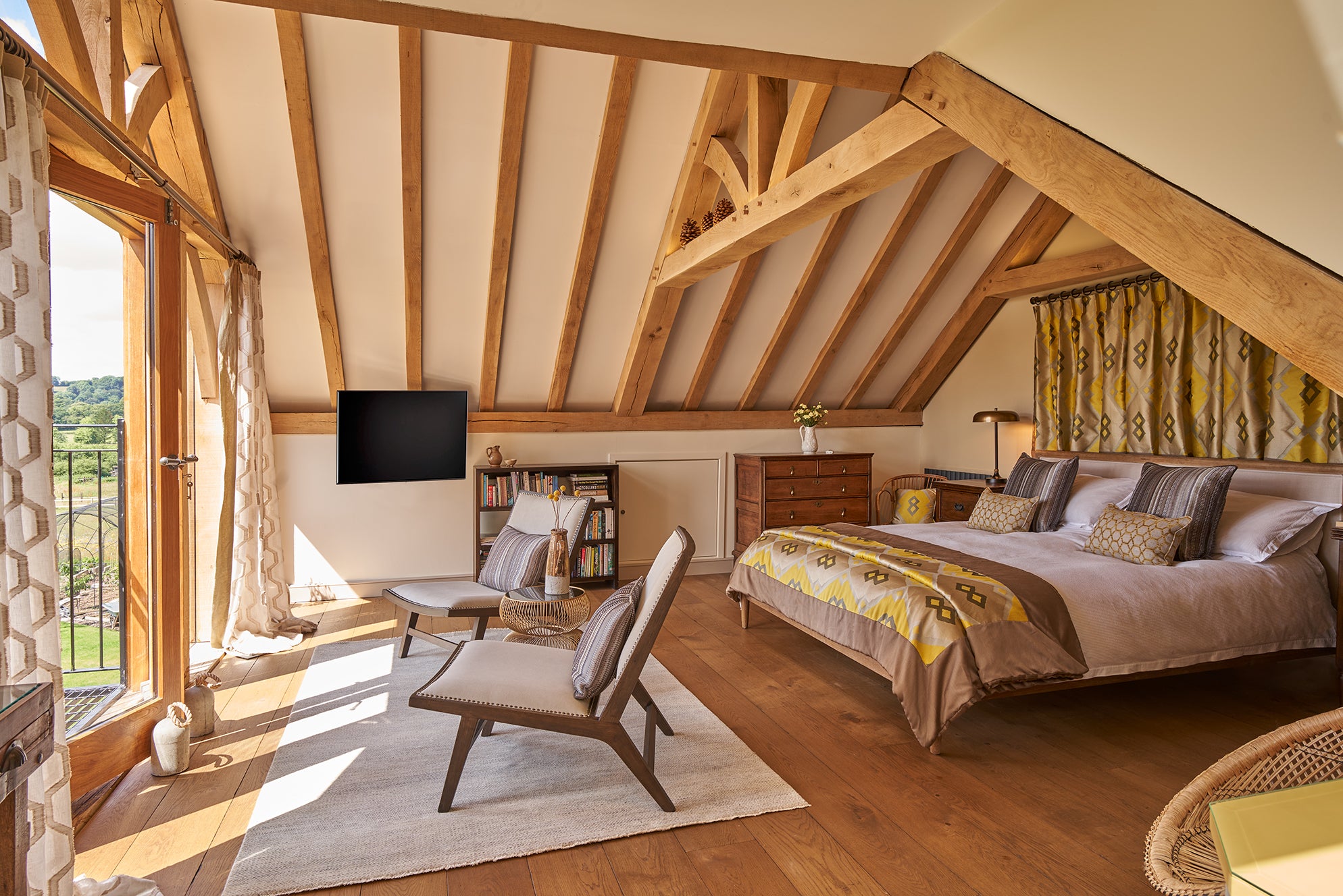 Wide oak boards run throughout, providing a natural bridge between old and new while bringing timeless character to every room. The oak-framed extension houses an open kitchen with traditional cabinetry by Mark Wilkinson, and modern appliances, flowing into a peaceful kitchen snug. Above, the sunny master suite offers countryside views and includes an en-suite bathroom and dressing room.