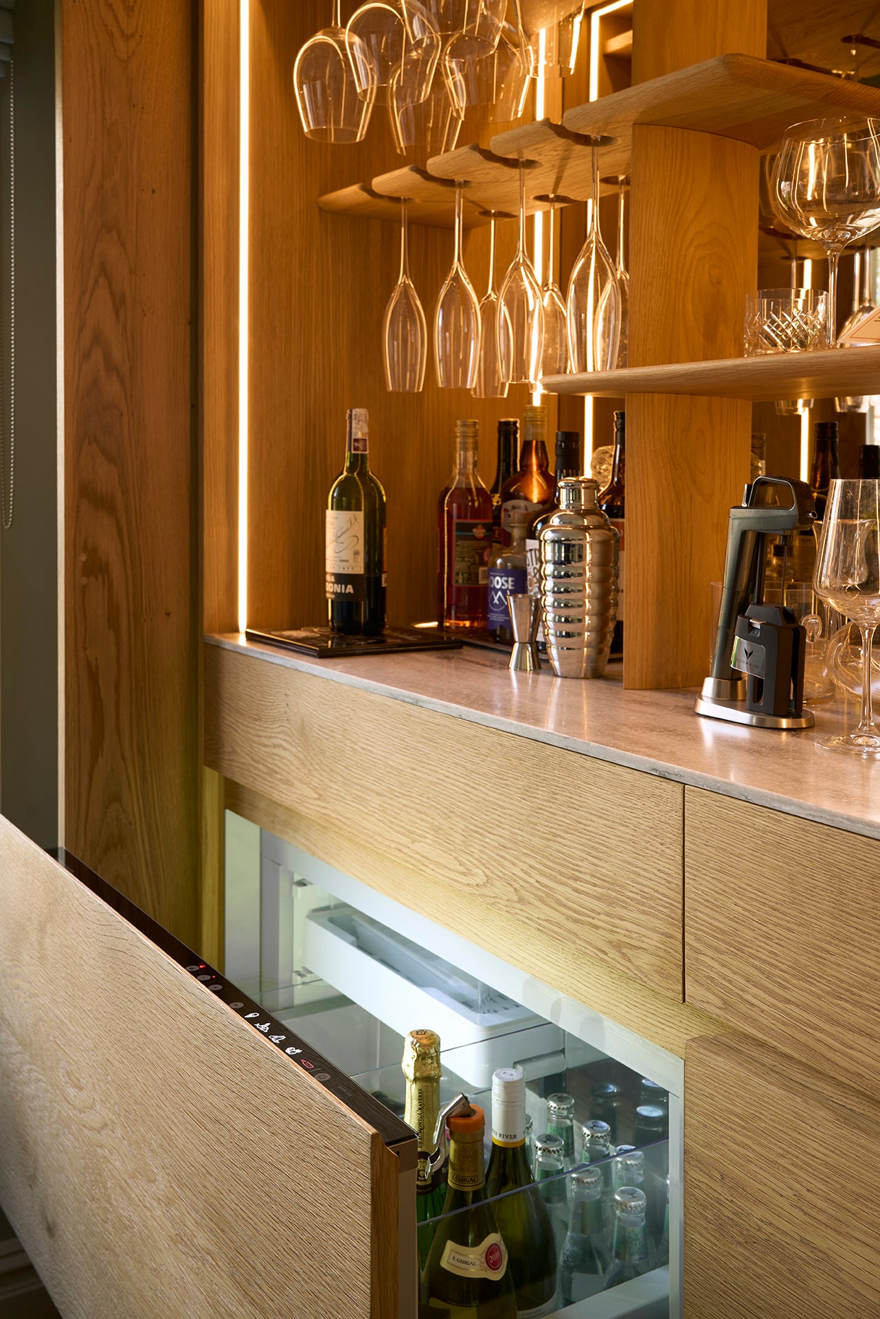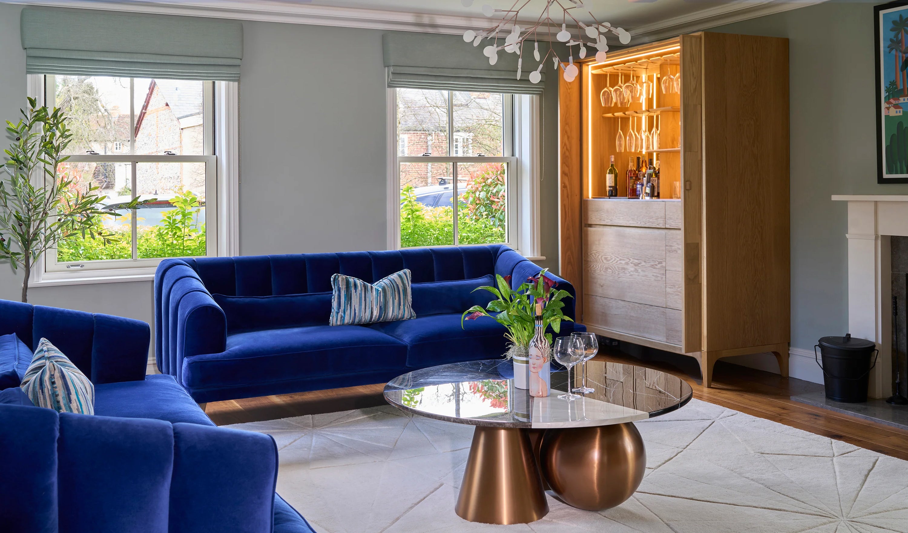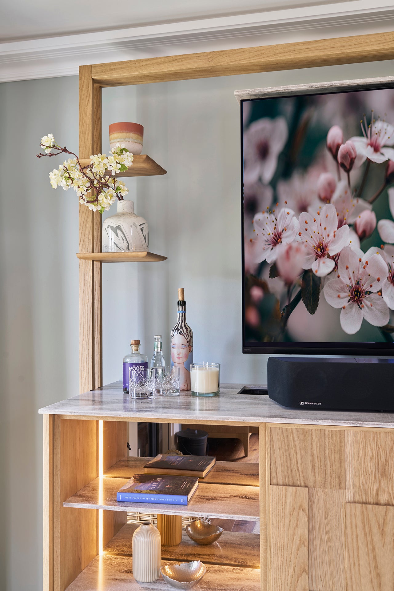 In the living room, we embraced Japandi elegance, designing and making a statement drinks cabinet with sliding pocket doors, oak detailing, and bronze mirrors. The cabinet integrates a Fisher & Paykel Cool Drawer and wine storage, making entertaining effortless. A matching media unit conceals the TV behind a motorised lift, complemented by sculpted oak shelving. Bold cobalt sofas and a Moooi light fixture create drama, while a geometric copper-based coffee table adds warmth.