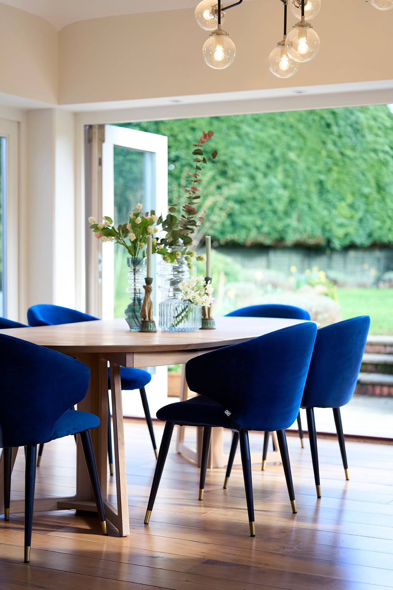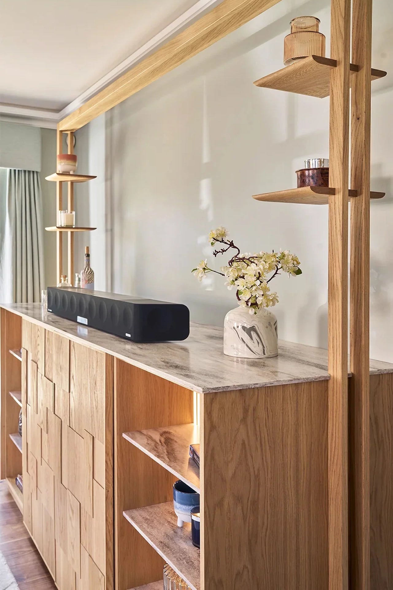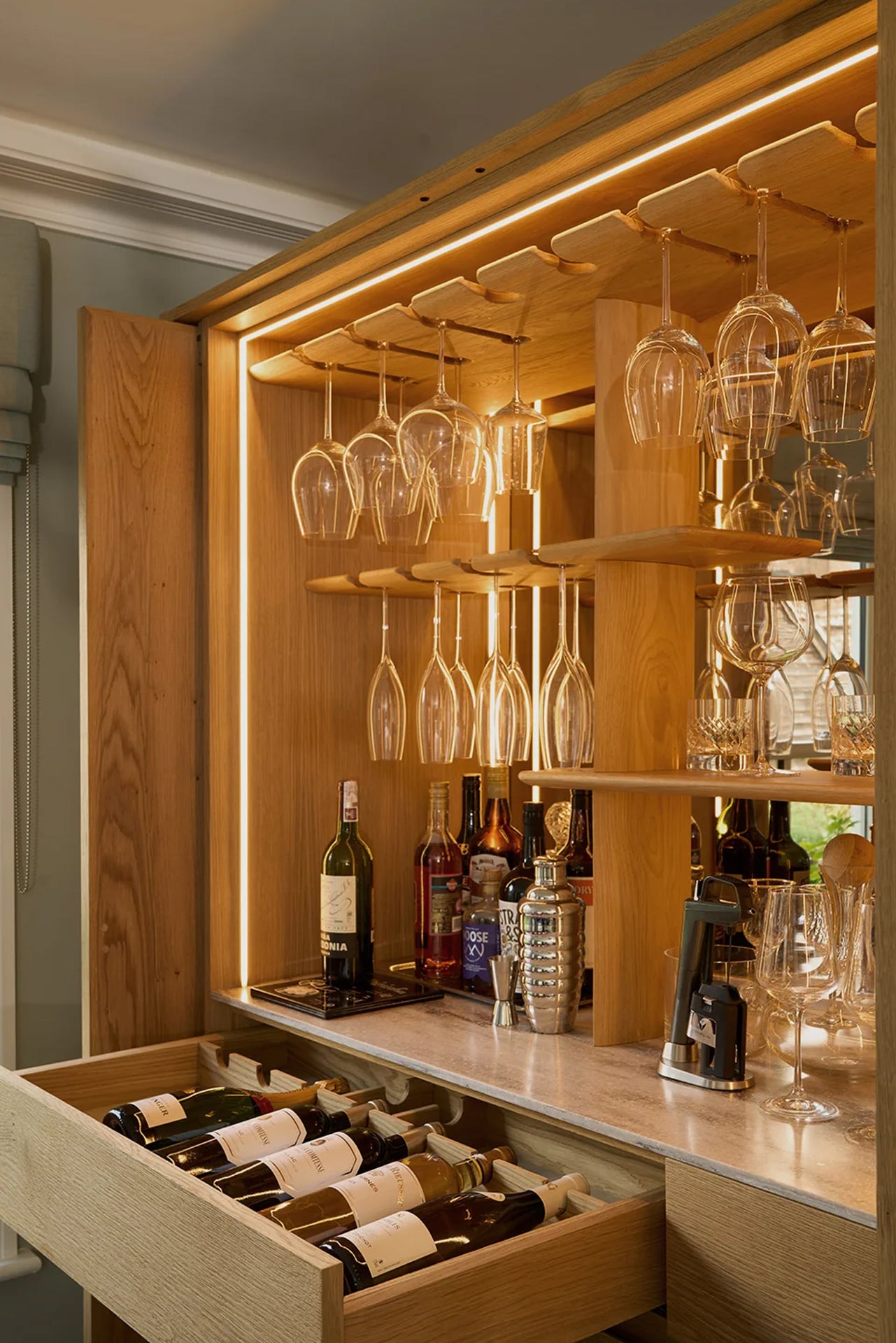 In the living room, we embraced Japandi elegance, designing and making a statement drinks cabinet with sliding pocket doors, oak detailing, and bronze mirrors. The cabinet integrates a Fisher & Paykel Cool Drawer and wine storage, making entertaining effortless. A matching media unit conceals the TV behind a motorised lift, complemented by sculpted oak shelving. Bold cobalt sofas and a Moooi light fixture create drama, while a geometric copper-based coffee table adds warmth.