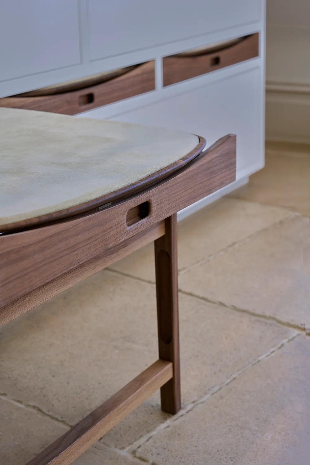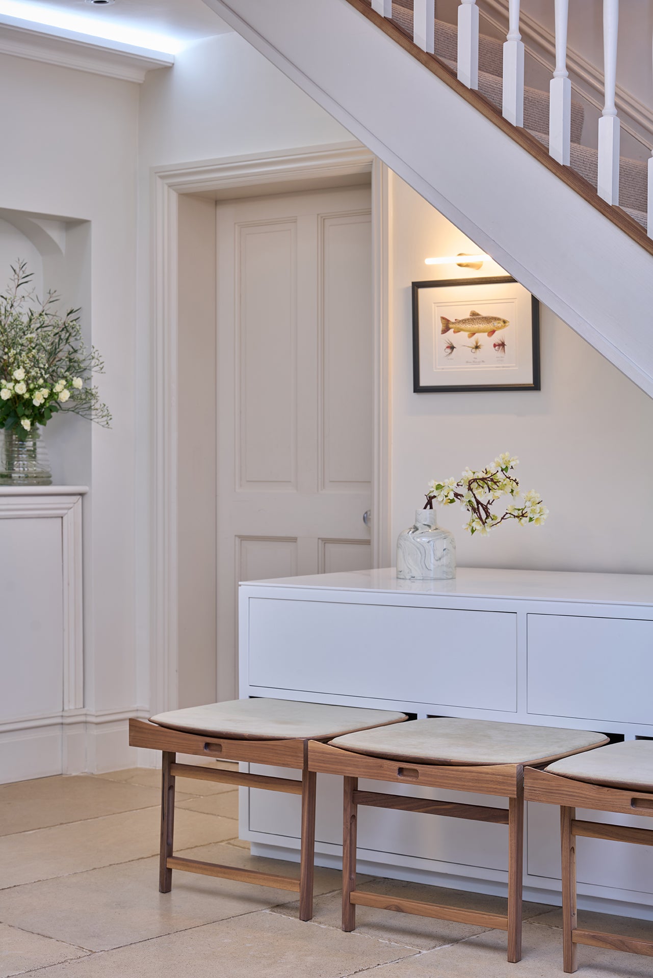 Storage solutions are both beautiful and practical - the hallway features a Hi-Macs-clad under-stair unit with Alcantara-upholstered pull-out seats, while the master suite includes LED-lit wardrobes and an Alcantara-lined jewellery storage. Throughout, bespoke joinery in walnut and oak adds refinement, from the snug's storage to the children's practical wardrobes.