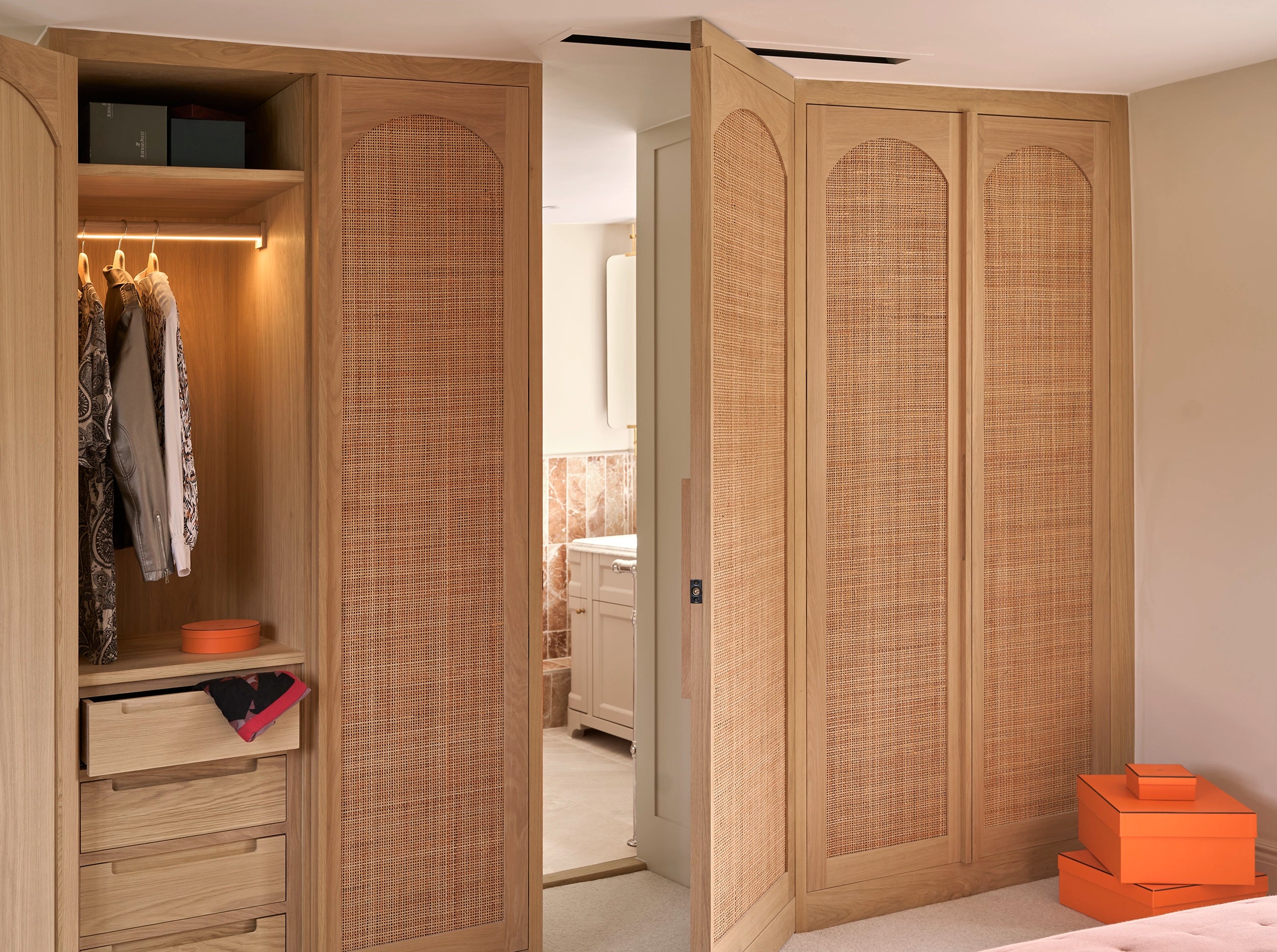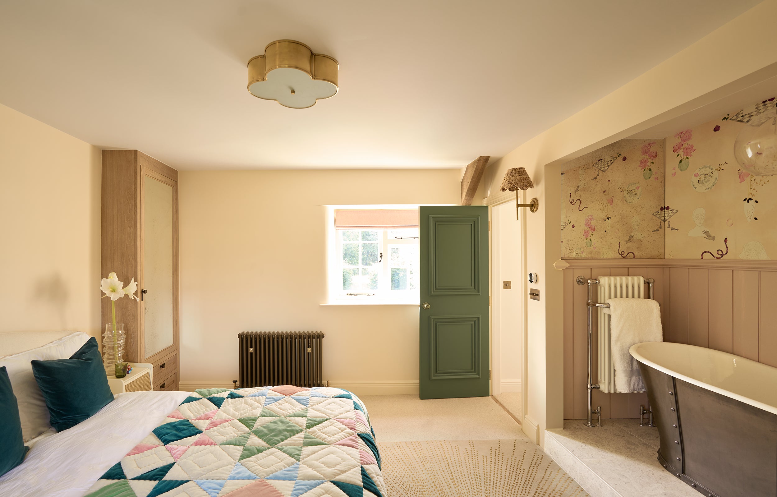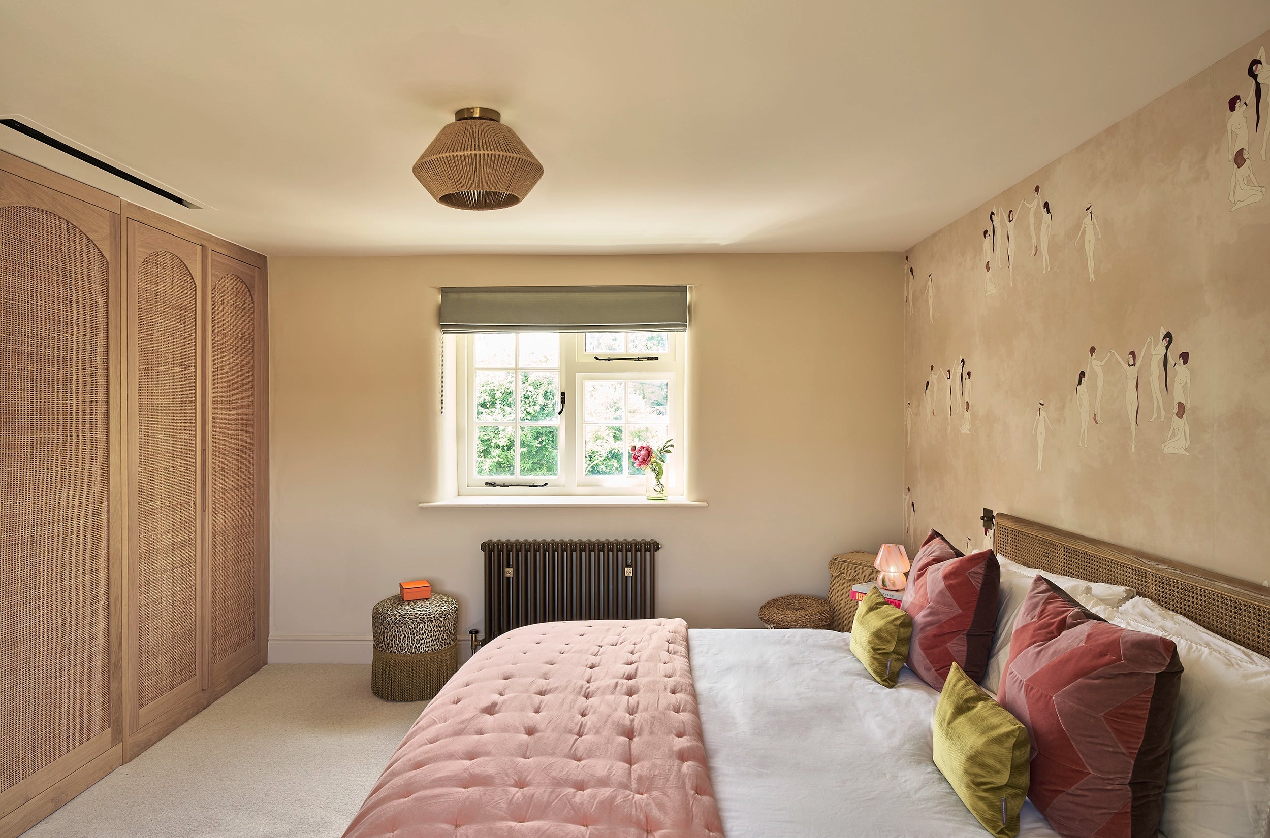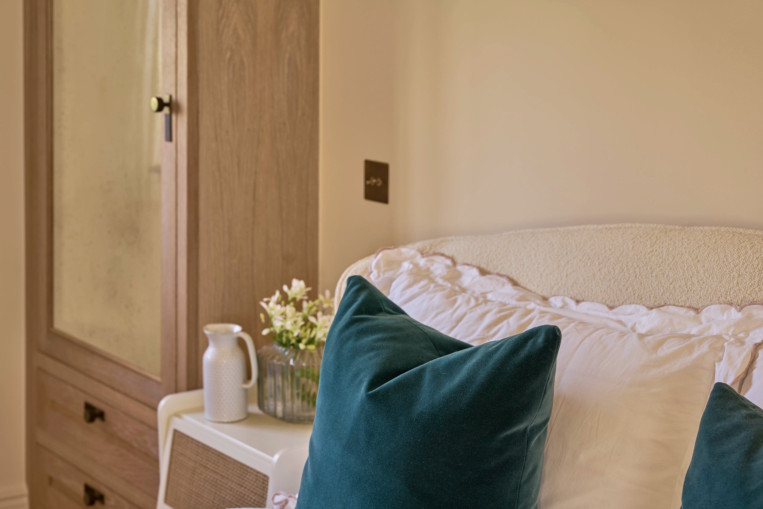 We developed every element of the transformation. Combining modern farmhouse and bohemian styles, from traditional ironmongery to contemporary lighting solutions, each choice was carefully considered to bridge rustic charm with modern luxury. Our joinery features honey-coloured oak and rustic rattan to complement the natural stone and moulded doors to gentrify the architecture and give a nod to our clients' previous London life.