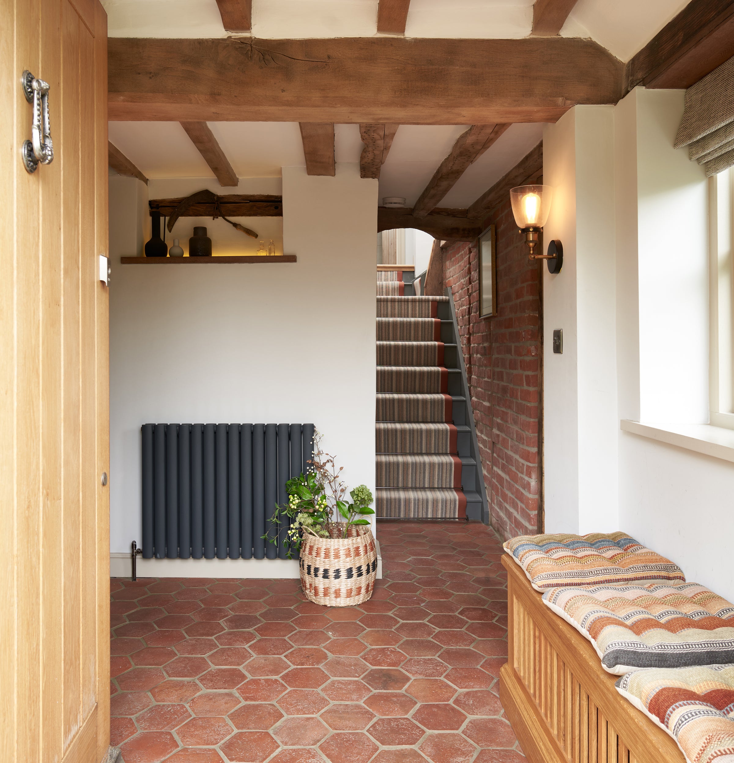 We began by stripping the original farmhouse walls back to brick, then used traditional lath and lime plaster techniques to restore their organic, natural feel. Original beams were carefully cleaned and nourished with beeswax, bringing out their rich character while protecting them for years to come. Throughout the house, we used breathable Farrow & Ball paints to ensure the building could maintain its natural balance.