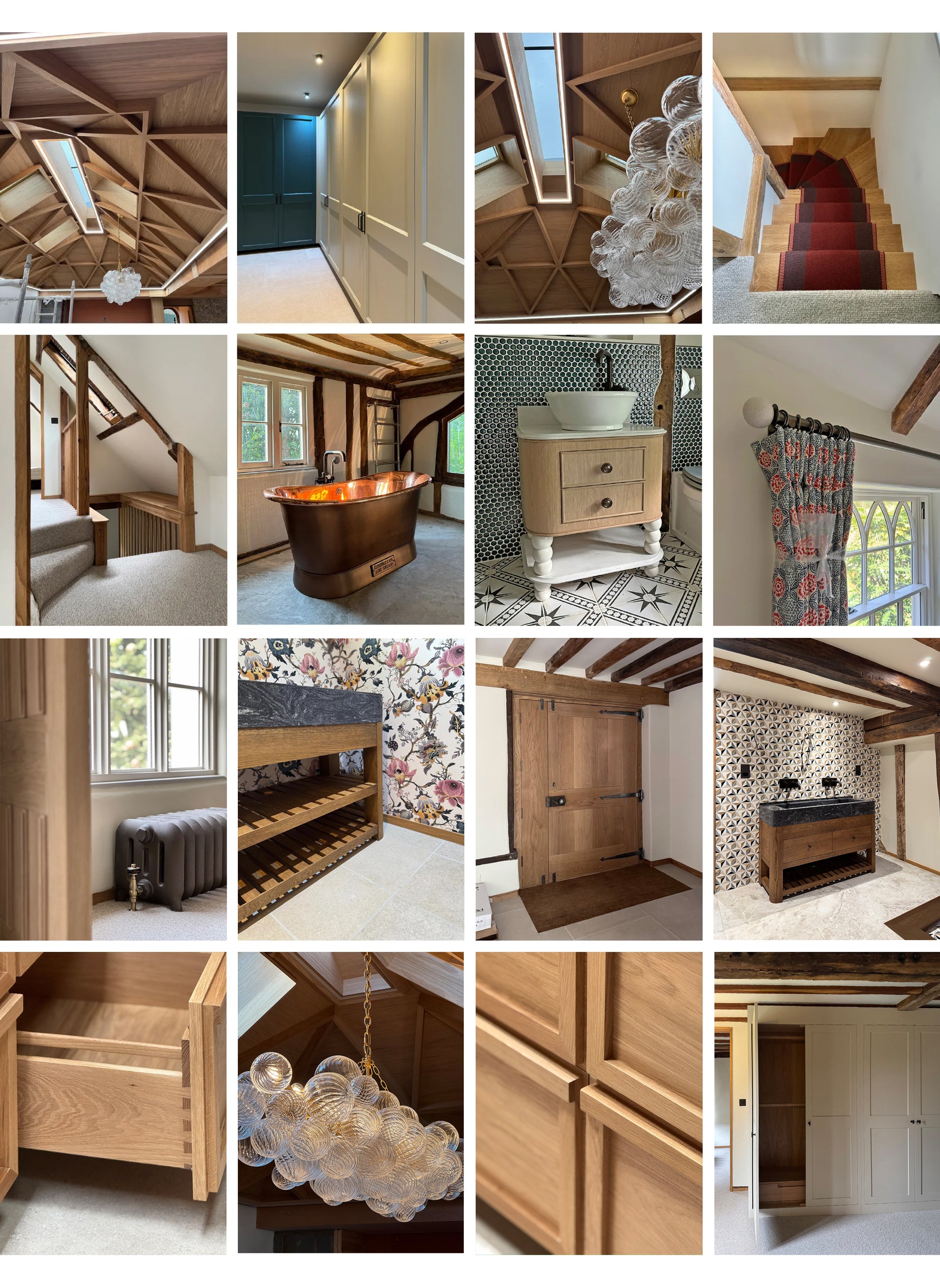 In the modern extension, we commissioned the architect and structural engineer to ensure the realisation of our unique ceiling design - designed and made to create visual harmony with the original farmhouse. This design carries through to the kitchen, where custom oak joinery forms a natural heart for the home. Each of the six bathrooms balances period charm with contemporary comfort, with Samuel Heath Brassware and a statement copper Catchpole & Rye bath in the master ensuite; while all bedrooms feature fitted wardrobes that blend practicality with style. Custom joinery flows throughout, from windows to arched oak doors, creating consistency between old and new sections.